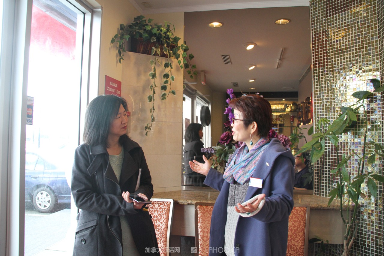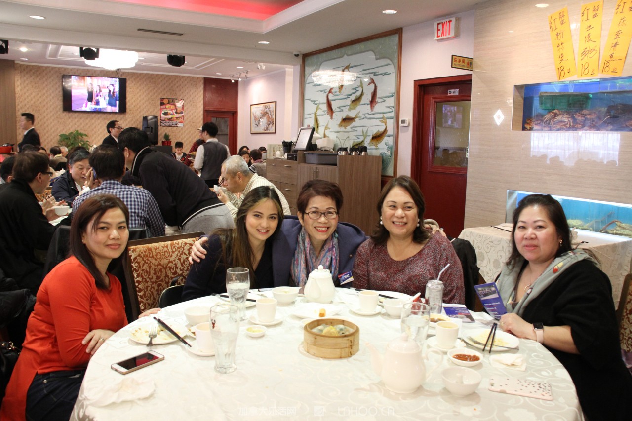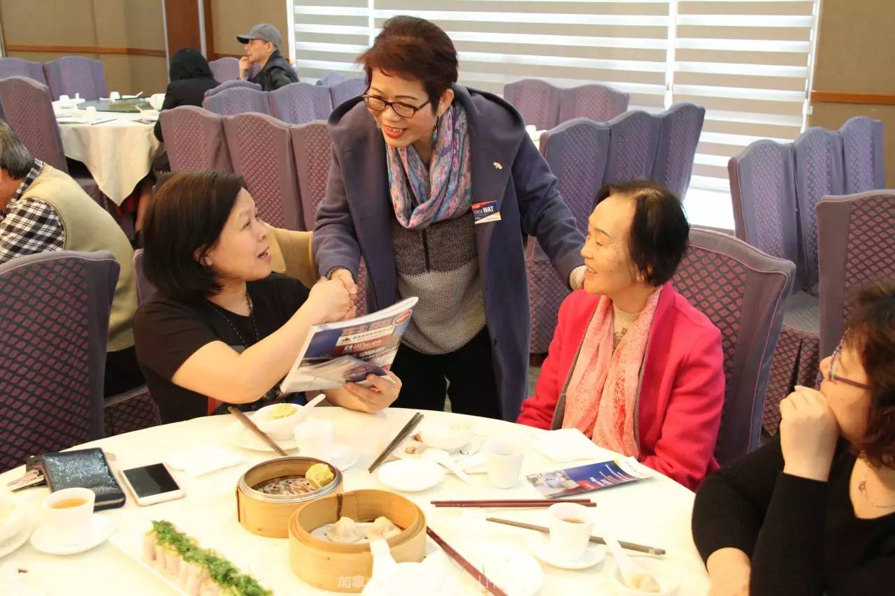 这一桌来自菲律宾移民,屈洁冰马上用英语亲切交谈,谈到自己去过马尼拉,并且在大温地区经常会去菲律宾社区走访,参加社区活动