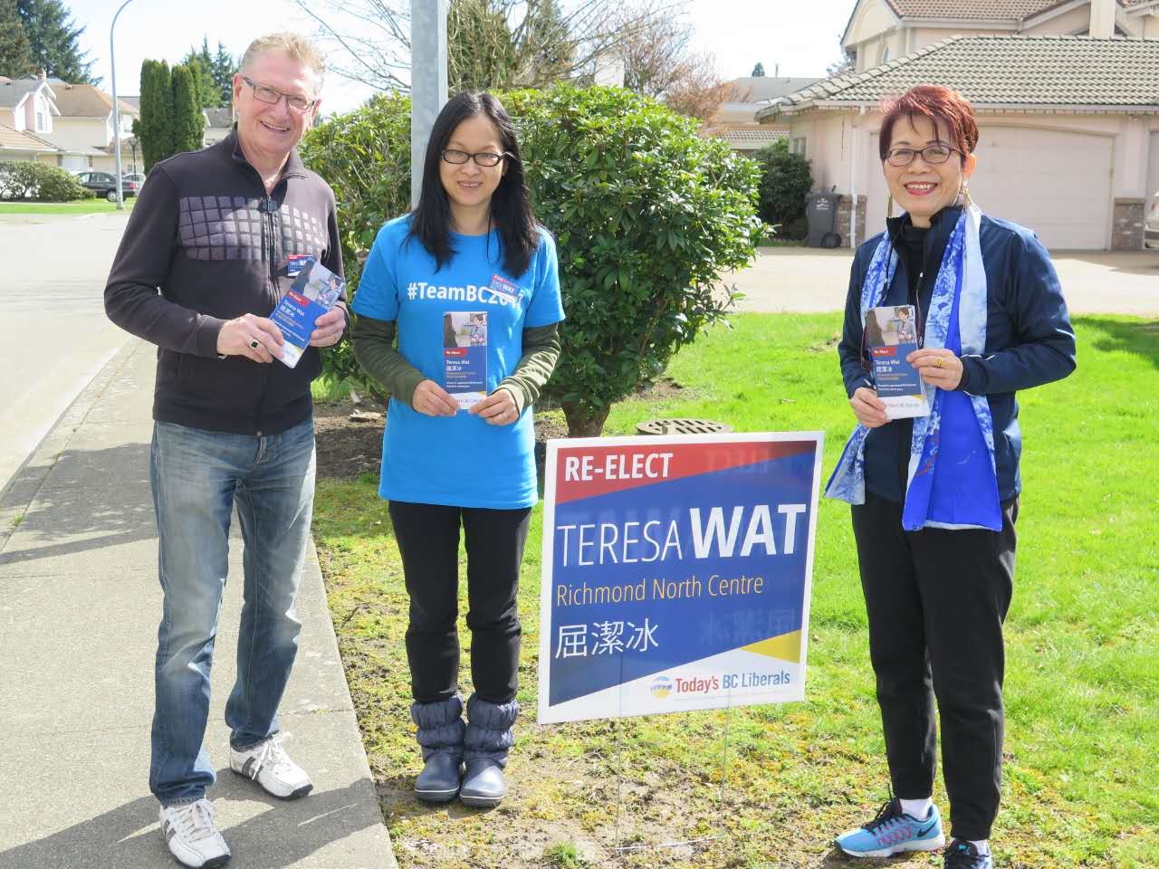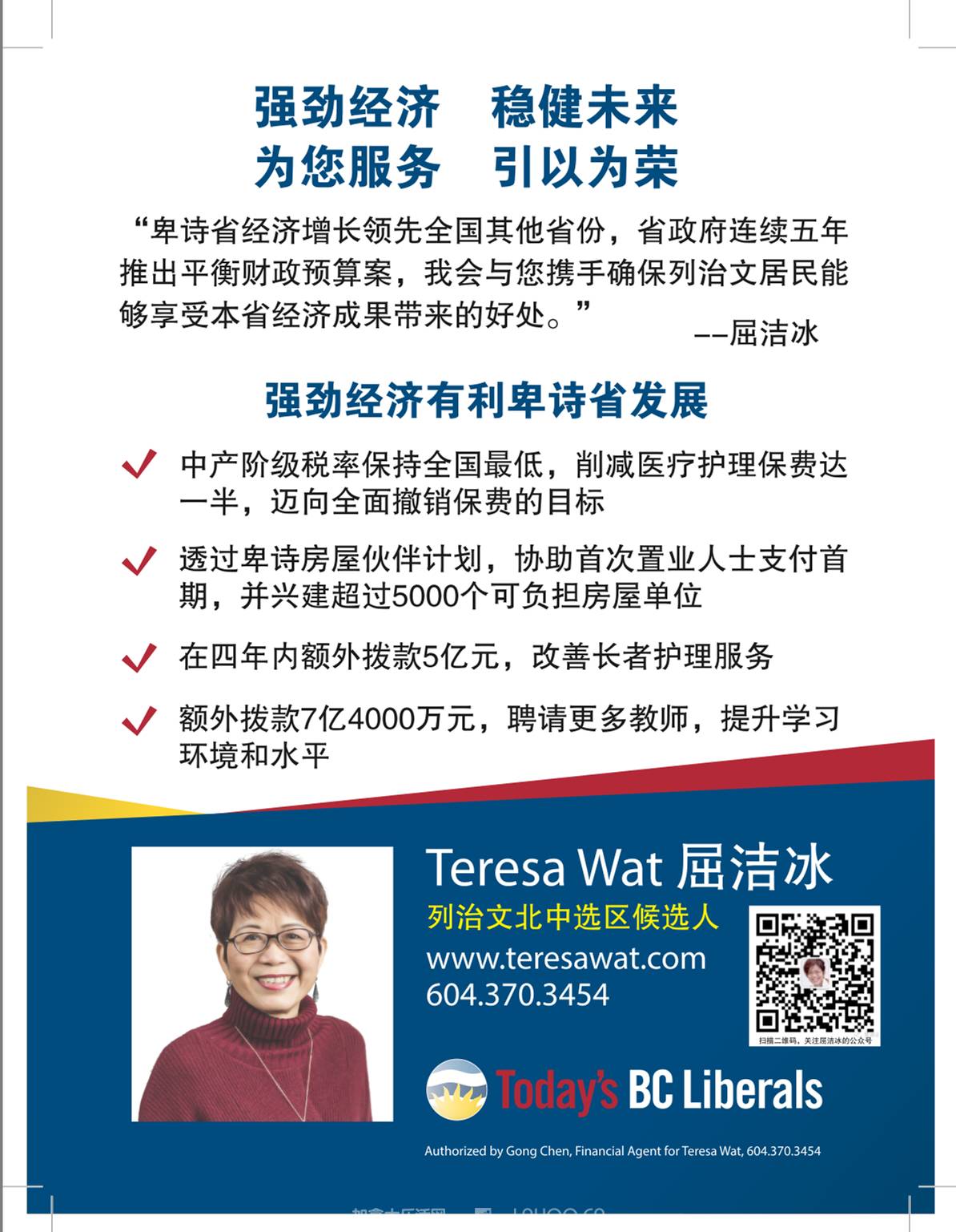 今年的省选,请投出您宝贵的一票,支持卑诗自由党,支持屈洁冰Teresa Wat。如果我当选连任,我会继续实践为选民热忱服务的理想, 大力推动贸易, 深化完成我在任期间已经展开的项目,兢兢业业为选民服务。