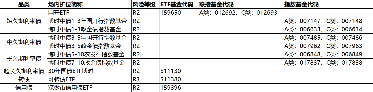 1. 短久期利率债方面,博时国开ETF(159650)紧密跟踪中债0-3年国开行债券指数,以T+0交易、场内质押回购和跨市场互联互通等优势成为流动性管理工具标杆。成立以来年化回报2.69%,比较基准年化回报率2.79%。