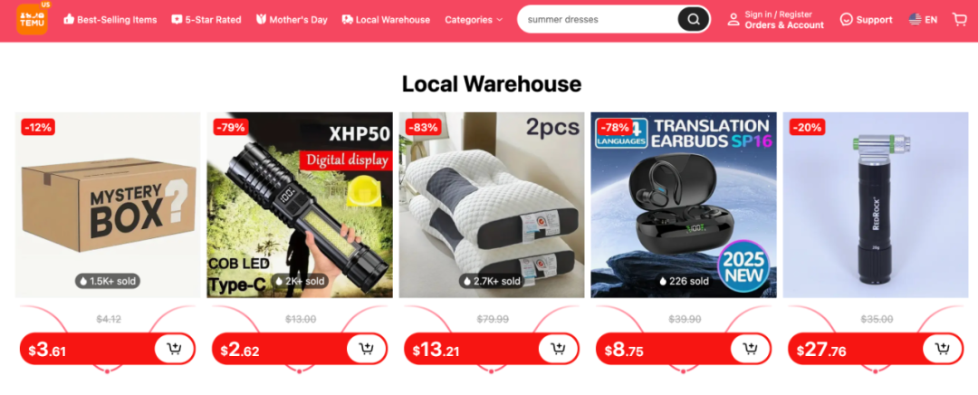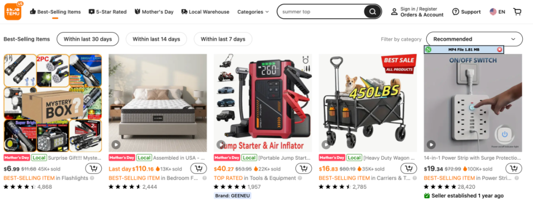 Temu美国站销量最佳商品均在800美元以下,图/Temu官网