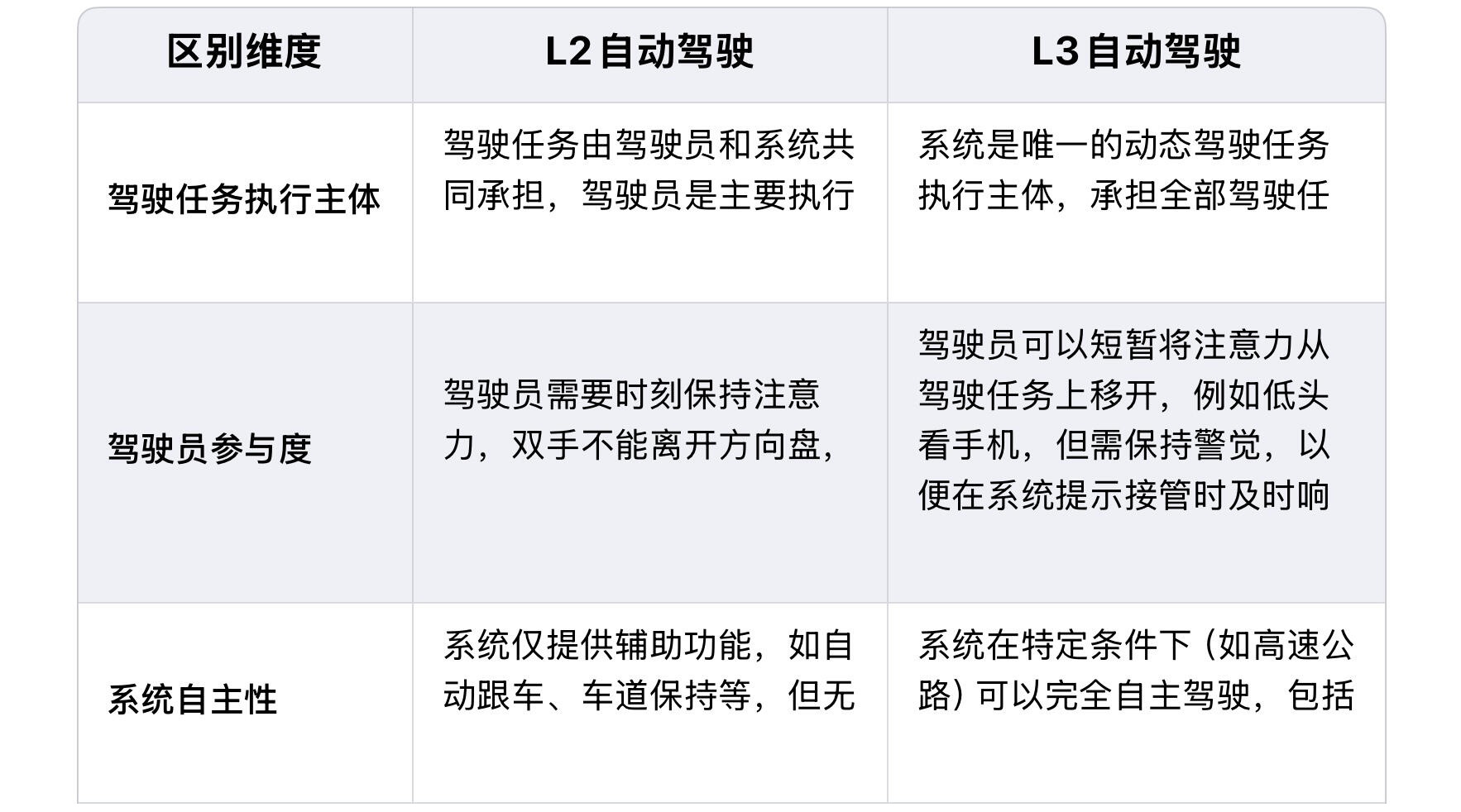 从L2到L3,标志着自动驾驶从“辅助”向“自主”迈出了关键一步,它重新定义了驾驶员与车辆的关系,也为自动驾驶技术的大规模商业化应用带来了新的曙光。
