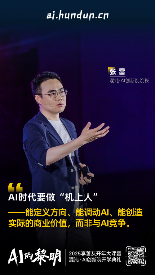 混沌·AI创新院院长张雷的演讲,以一段震撼视频开场:混沌自研的 “Deep Innovation” 智能助手,正在帮学员企业拆解商业模式,生成竞品分析报告。“不要做与 AI 竞争岗位的‘机下人’,而要成为给 AI 发工资的‘机上人’。” 他提出的 “机上人” 理论,让现场气氛升温。