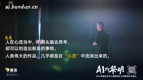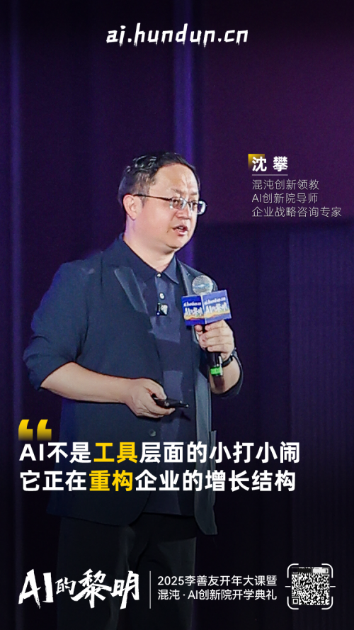 李善友教授的身影在聚光灯下升起,背后巨幕上 “AI 的黎明” 五个大字缓缓展开 —— 这是 “2025 李善友开年大课暨混沌 AI 创新院开学典礼” 的首日现场,一场注定写入中国商业史的思想风暴,正以创业者为圆心,向整个商业世界辐射能量。