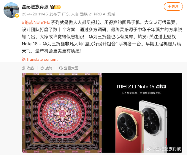 4月29日,魅族Note16外观公布,有网友认为其镜头模组设计与华为三折叠手机Mate XT有相似性。对此,星纪魅族集团中国区总经理肖波在微博发文回应称,设计团队打磨了数十个方案,通过多方调研,最终灵感源于中华千年藻井的方案脱颖而出,“大家或许觉得似曾相识,华为三折叠也心有灵犀”。