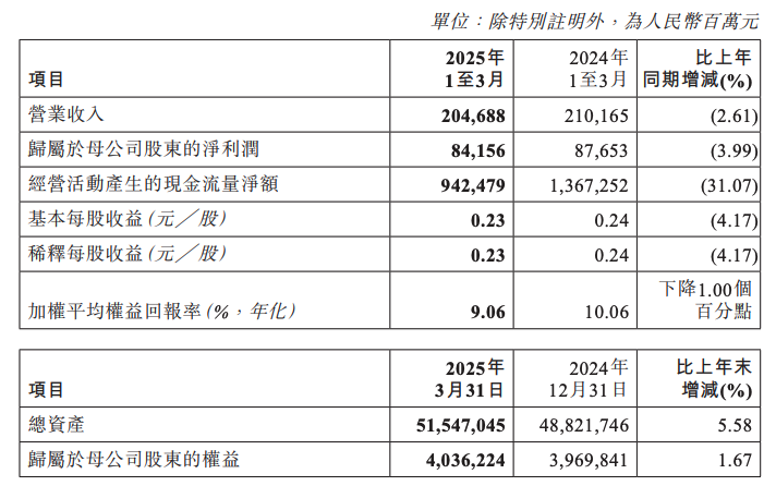 4月29日,工商银行在港交所公告,2025年第一季度营业收入为2046.88亿元,同比下降2.61%;归属于母公司股东的净利润为841.56亿元,同比下降3.99%。