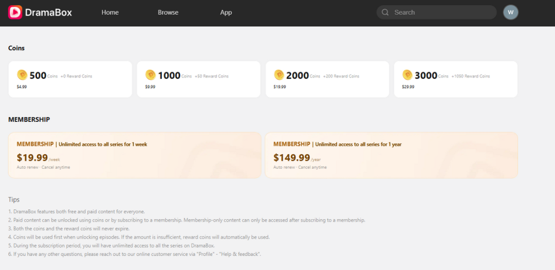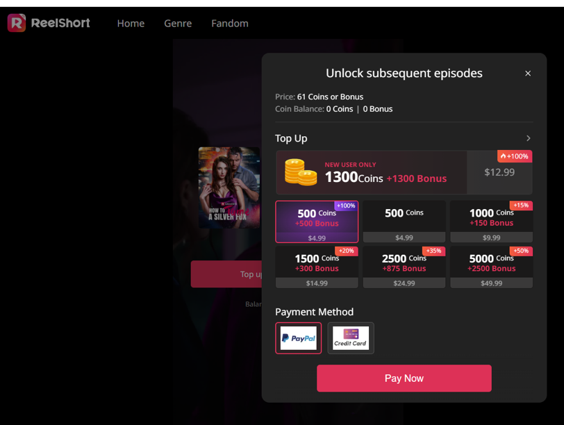 在Reelshort上,解锁一集需要61个币,Reelshort设置了4.99美元500个币起步的充值机制,首充双倍。对新用户还提供2600个币12.99美元的首充福利。实际折算一下,用户每看一集需要支付0.3到0.6美元,换算成人民币大约2-4元一集,看完一部80集的短剧要支付至少148元(前6集免费),比打折后爱优腾一年的会员年费还要高。DramaBox同样设置了4.99美元500币起步的充值机制,而可以无限解锁的顶配年卡标价达到149.99美元。