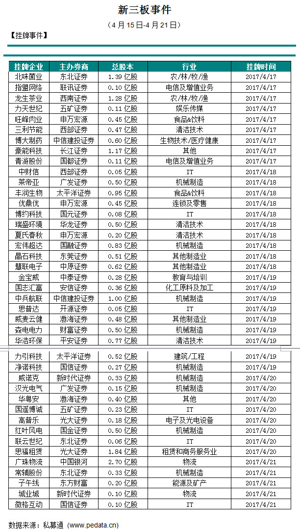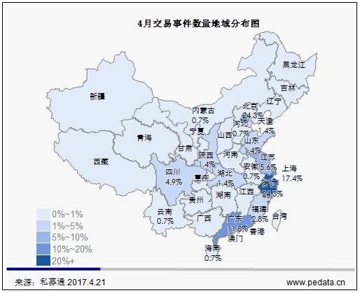 截止本周五下午,投资、上市和并购共145起事件,涉及总金额397.835亿元人民币。从交易金额来看,涉及金额较大的事件是2017年4月15日,黄山金马股份有限公司成功受让天津依帆资产管理中心(有限合伙)、肖行亦、杭州金葵股权投资合伙企业(有限合伙)、强艳彬、诸葛谦等持有的永康众泰汽车有限公司100%股权,作价116亿人民币。从交易事件地域分布看,目前主要分布在北京市、浙江省和上海市,占比分别为24.3%,24.3%和17.3%。本周新三板市场共有41家企业挂牌,新增加股本为21.71亿股,本周新三板成交总金额为47.09亿元人民币,目前共有11109家企业挂牌新三板,总股本为6341.74亿股。