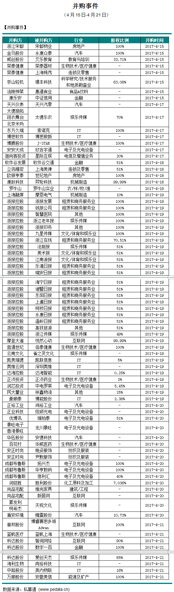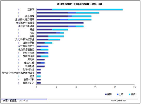 截止本周五下午,本周并购市场共发生48起并购事件,交易金额为70.16亿元人民币。从并购事件交易数量来看,本周IT行业发生8起并购事件,排名第一。本周并购金额较大的并购事件是:2017年4月15日,黄山金马股份有限公司成功受让天津依帆资产管理中心(有限合伙)、肖行亦、杭州金葵股权投资合伙企业(有限合伙)、强艳彬、诸葛谦 等持有的永康众泰汽车有限公司100%股权,作价116亿人民币。本次交易完成后,上市公司可以共享众泰汽车研发平台,联合开发汽车电子电器产品,众泰汽车的研发团队及创新研发能力将为上市公司提供强大的技术支持,双方在资源共享的基础上实现协同发展,并在产品开发、技术创新、行业发展动态把握上实现互补,有效降低开发成本,缩短研发周期,提高产品质量。