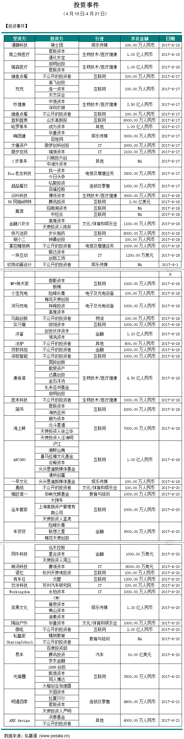 截止本周五下午,共发生43起投资事件,披露投资金额事件38起,共计25.39亿元人民币。本周涉及金额较大的投资事件发生在IT行业,事件是:2017年4月18日,腾讯投资投资北京五八信息技术有限公司2亿美元。本轮融资后,58集团将继续持有转转多数股权。公司考虑更多得是战略层面的意义。一方面能拉进在资源方面能够深入合作的盟友,另外一方面则是希望转转在团队机制、决策的流程上能够走得更快。转转将继续专注于二手交易市场的拓展,深度挖掘用户体验,加速提升转转在二手交易领域的服务和技术能力。