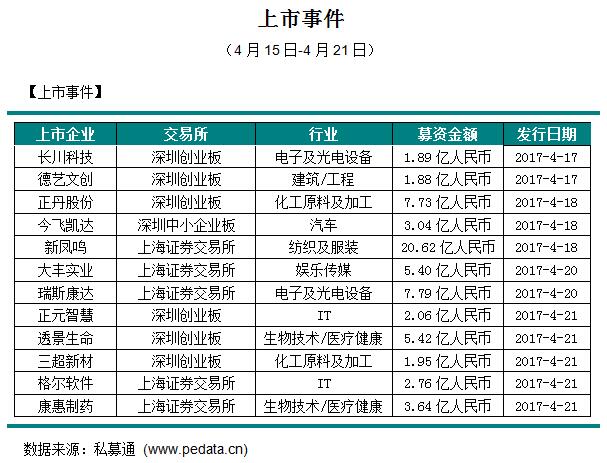 截止本周五下午,本周共有12家企业上市,总融资金额57.34亿元人民币。本周融资金额较大的上市事件为:2017年4月18日,新凤鸣集团股份有限公司在上海证券交易所上市,发行股票7730万股,每股发行价26.68元人民币,共募集资金金额20.62亿元人民币。公司创办于2000年,现已发展成为集聚酯、涤纶纺丝、加弹、进出口贸易为一体的现代大型股份制企业,下设中欣化纤、中驰化纤、中辰化纤、进出口公司等九家子公司,拥有省级技术研究院——浙江新凤鸣化纤研究院、院士工作站等科研机构。此次新凤鸣正式登陆A股市场,筹集资金将用于差别化纤维项目,为新凤鸣构筑“化纤王国”直接接通了资本市场,拓展了发展空间。