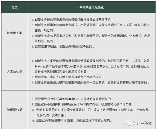 (三)关键风险要素的管理。风险要素分为共同要素和特定要素,其中共同关键风险要素适用于所有商业模式、产品等各类创新,特定关键风险要素仅适用于部分特定的业务种类。新产品触及共同或特定要素之一的,即视为涉及关键风险要素的创新,应按要求报送风险集中评审。