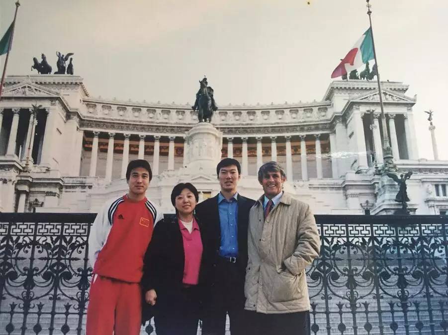 (中国队与拉齐奥比赛期间笔者与米卢、祁宏、宋黎辉在罗马西班牙广场前合影)