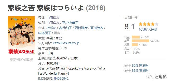 《家族之苦》是导演山田洋次2016年在日本上映的喜剧电影,桥爪功 、 西村雅彦 、 夏川结衣 、妻夫木聪 、 苍井优主演,豆瓣评分8.1。