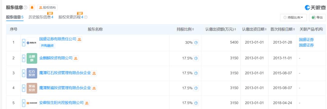 天眼查信息显示,江信基金成立于2013年1月,国盛金控旗下全资子公司国盛证券持股30%,为第一大股东,另外4家股东均持股17.5%。