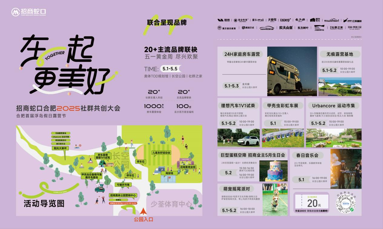 招商蛇口合肥2025业主社群共创大会美好启幕,5.1-5.5 合肥首届浮岛假日露营节上线,20+潮流品牌联盟、20+主理人灵感碰撞,市集、手作、亲子、艺术……,专属家人的黄金周微度假之旅,五一来招商奥体公园尽兴欢聚。