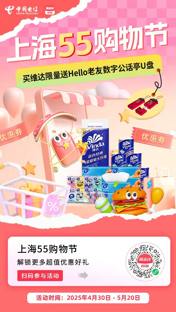 近日,上海“五五购物节”正式拉开帷幕,中国电信上海公司(以下简称“上海电信”)携手中国电信翼支付重磅打造的购物节也同步启动,于4月28日至6月7日推出线上线下联动的消费促进活动,通过整合电商资源、优化消费场景、创新权益模式,旨在为上海市民打造覆盖全渠道的数字化消费体验,助力城市消费能级提升。