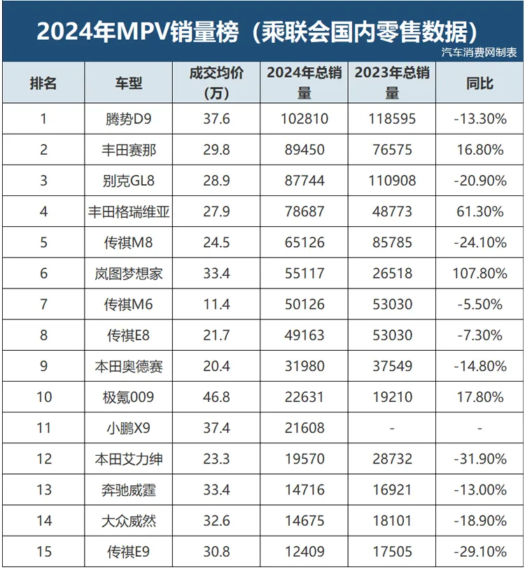 然而,在理想 MEGA 沉沦的一年中,市场竞争格局发生了巨大变化。2024年,比亚迪旗下的腾势D9, 以超过10万辆的成绩成为MPV年度销量冠军,是其继2023年取代别克GL8获得冠军宝座之后,再次摘得桂冠。