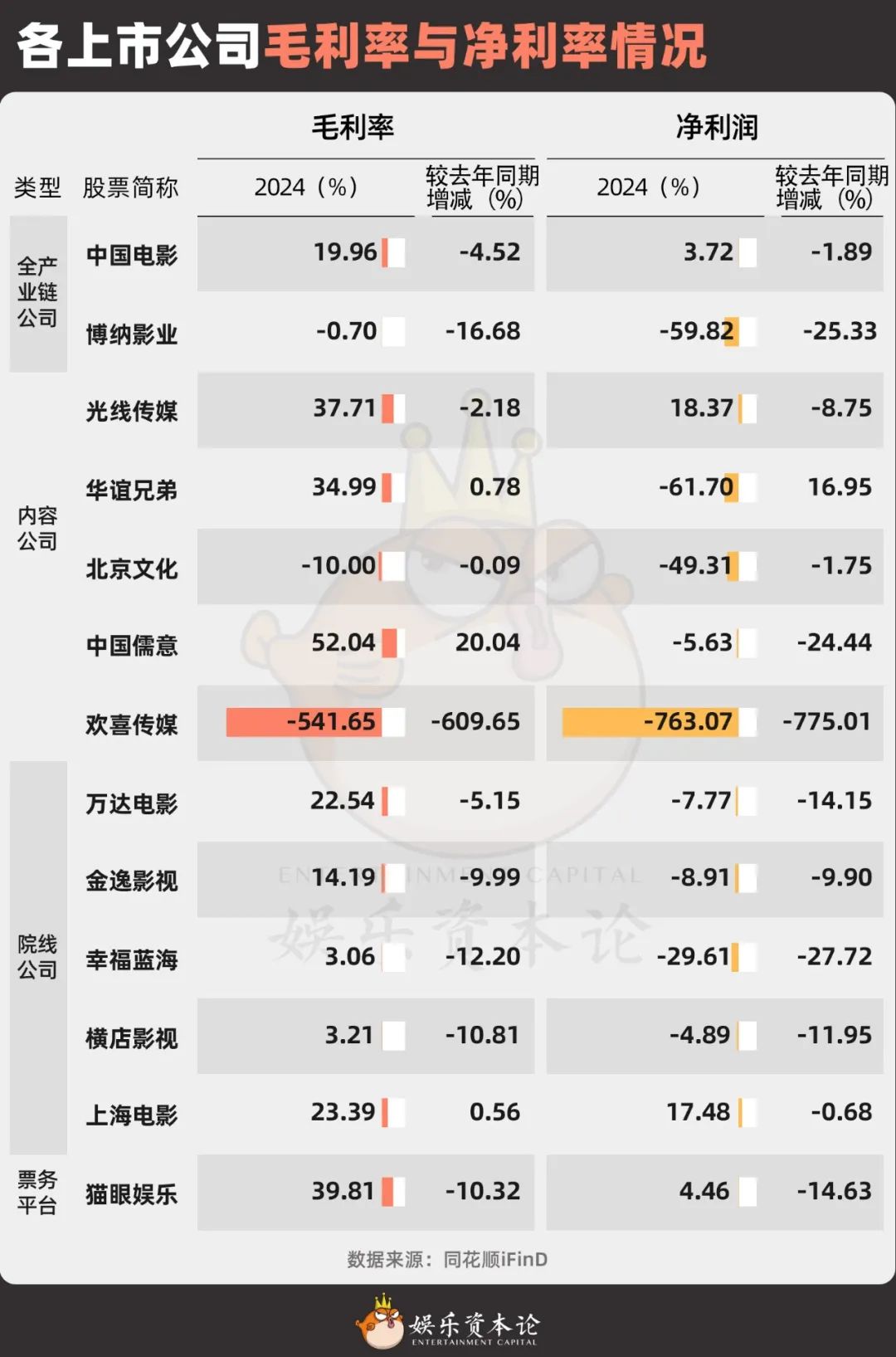 从同样握有核心发行资源的猫眼娱乐来看,猫眼的娱乐内容服务(包括发行和投资等)收入2024年下降14%;抛去电影及电视剧投资的公允价值收入(2024年收入27.5百万元,2023年亏损3.2百万元)影响,实际下降16%。