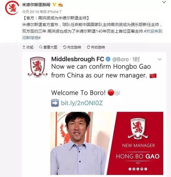 对了,今年愚人节那天一位微博认证为“米德尔斯堡新闻”的博主爆出猛料,说米德尔斯堡官方宣布签下前国足主帅高洪波出任球队主教练!新闻还配发了高洪波照片和米德尔斯堡的队徽,下面还有官宣的英文。还说得煞有介事,表示双方签约三年。高洪波也成为了米德尔斯堡140年历史上首位亚裔主帅。