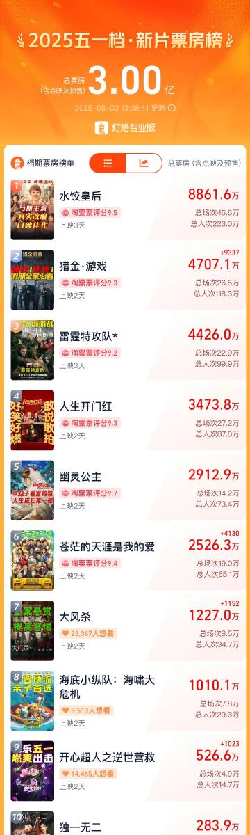 据灯塔专业版,截至5月2日13时38分,2025年五一档新片(含重映)总票房(含点映及预售)突破3亿,影片《水饺皇后》《猎金·游戏》《雷霆特攻队*》《人生开门红》《幽灵公主》《苍茫的天涯是我的爱》暂列前六。