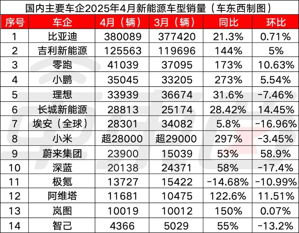 综合以上车企晒出的4月销售战报来看,多家车企同比都实现了增长,这也说明2025年新能源汽车市场还是比较火热的。