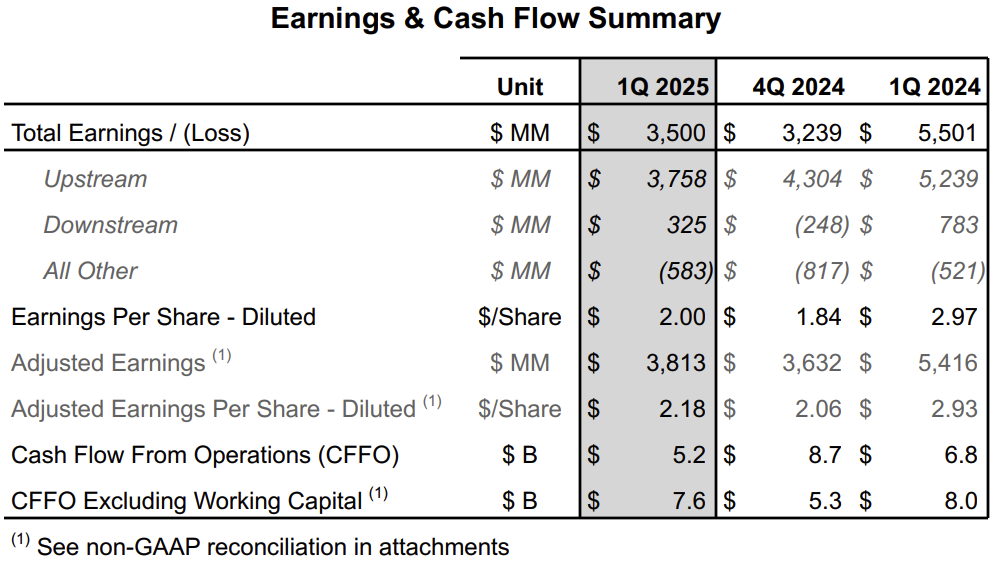 5月2日,雪佛龙公布,2025年第一季度调整后收益为38.13亿美元(摊薄后每股收益2.18美元),上年同期调整后收益为54.16亿美元(摊薄后每股收益2.93美元)。