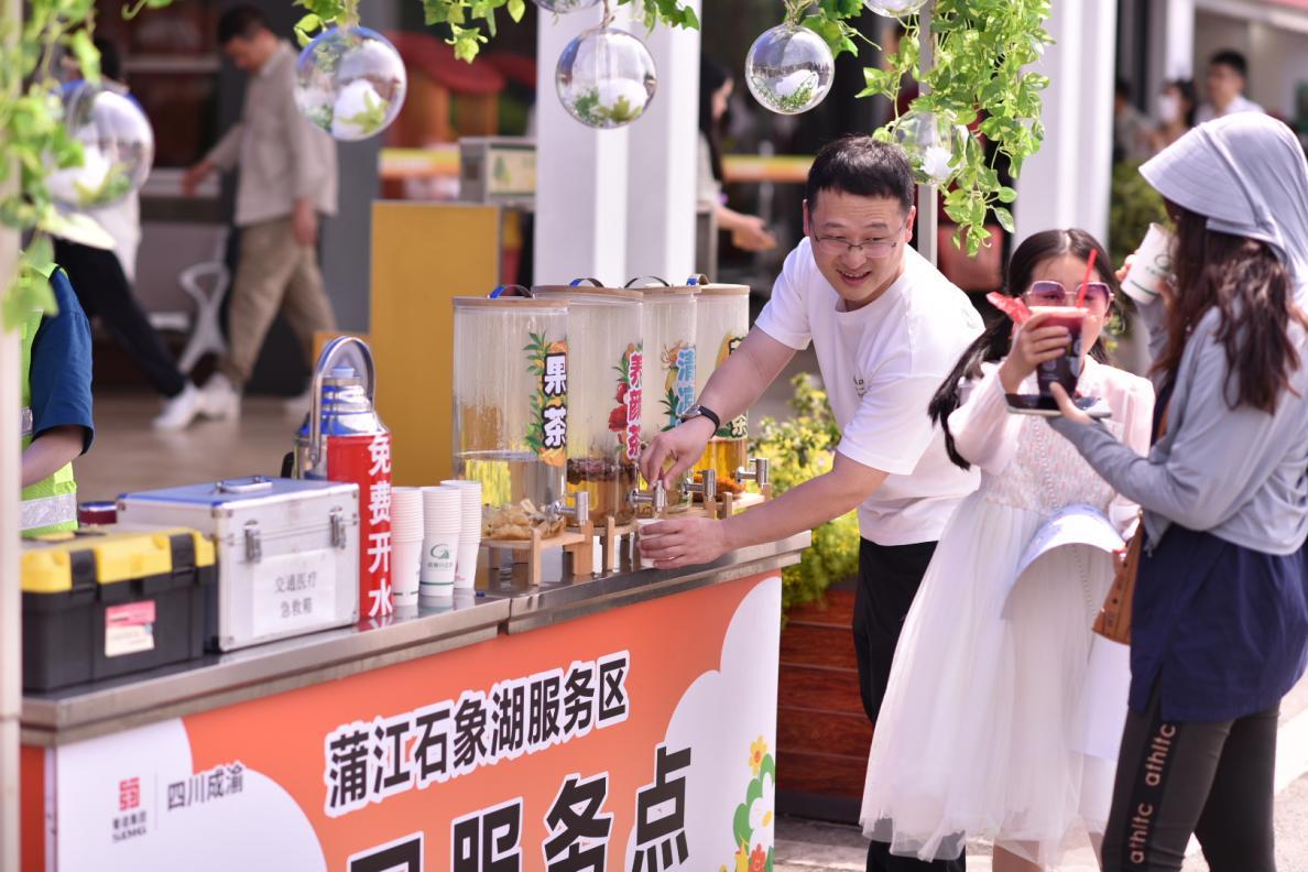 不仅有“景”,还有“情”。服务区熊猫文创快闪店萌力全开,结合蒲江特色,推出现榨“耙耙柑特调”,服务区工作人员还准备了免费的凉面、凉粉等四川特色美食供游客品尝。