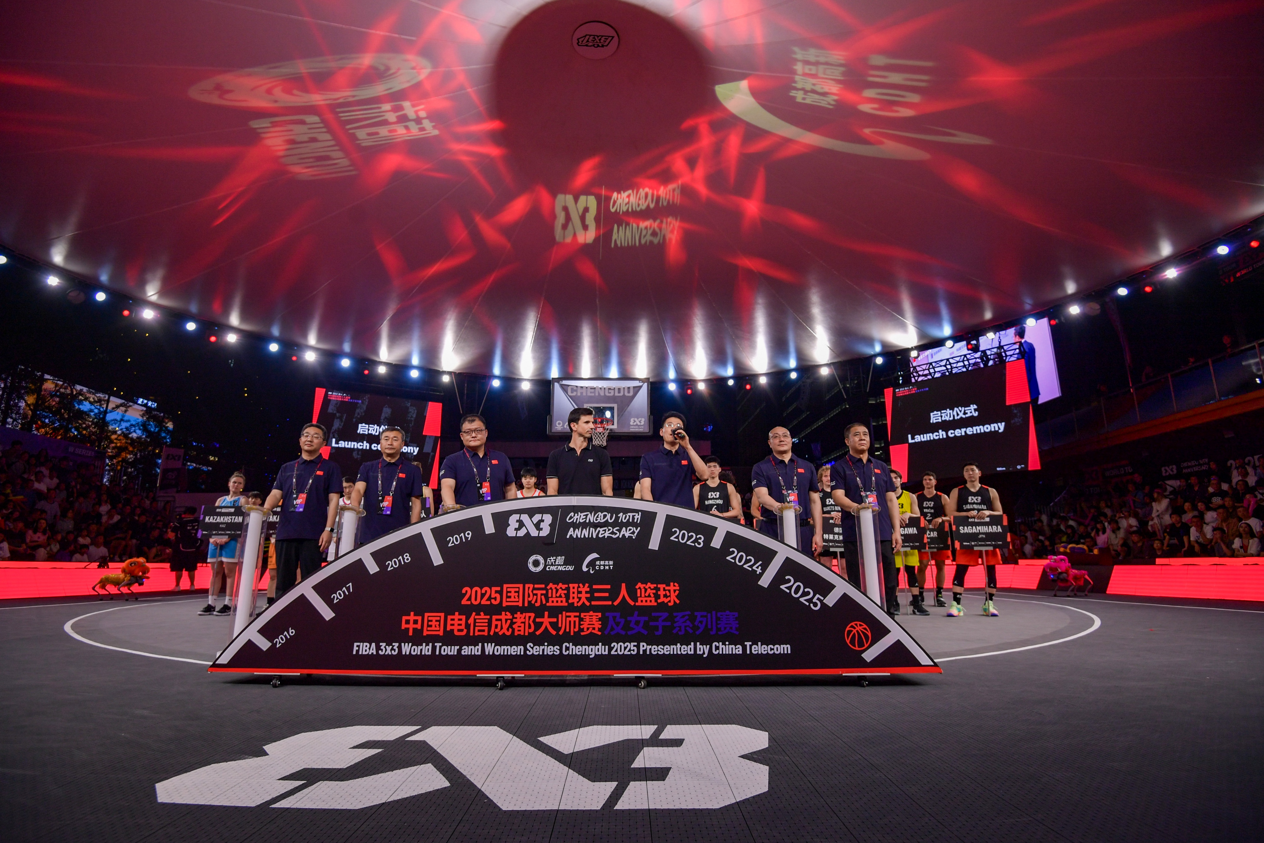 热血激情的开场视频《十分完美》点燃了开幕仪式现场,在全场球迷的欢呼声中,国际篮联三人篮球全球赛事和商务负责人伊格纳西奥·索里亚诺先生向成都授予了“FIBA3×3全球典范城市”称号。此后,嘉宾们上台一起按动启动柱,为比赛揭幕。