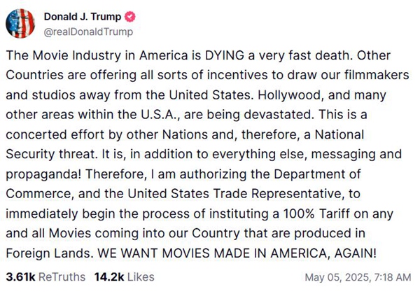 基于国家安全威胁,特朗普要求美国商务部和美国贸易代表立刻启动程序,对所有外国制作、进入美国的电影征收100%关税。