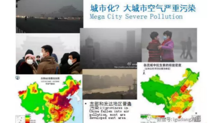 2012年中国进入经济下行期,正好是新的领导班子接任。先是提出新常态,两年后认同L型下滑。接着去年又有人说是连续L型。这种情况下,请问在座各位,哪个地区是靠自由市场经济改出危机的?全国没有一个。实际上还得靠国债投资。那就得找投资领域啊,开始找的是城市化。就在我们要沿着城市化思路往前走时,气候变暖沉重打击了这种旧的发展主义思想。华北遭遇大规模的雾霾,气候变暖,北方冷空气弱了,减少南下的力量。南方工业带污染的空气被暖湿气流顶推到北方,停留在华北平原上面。之所以到这里上不去,是被黄土高原、内蒙古高原挡住了。人们盼风,麻烦是寒流来的少了,即使来了力度也小了。