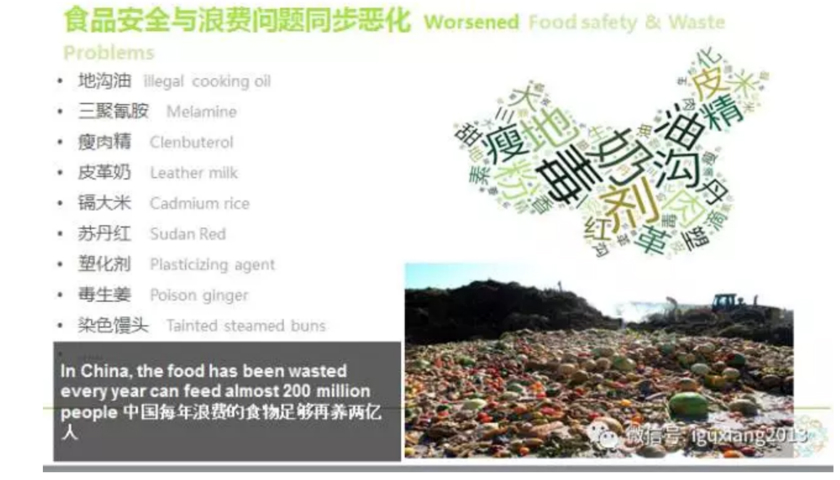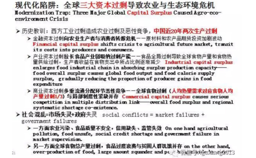 农业安全:中国面源污染。50%以上根源在于照搬殖民地才有的大农场模式,那就是被欧、日放弃的规模化。粮食安全最大难题是如何去库存。但,一方面我们库存积压,一方面发生走私进口。因为国内价格高,国外价格低。国内价格高的原因是国内成本高,政府不得不提高收购价。蔬菜,全球产量67%在中国,我们只有19%的人口。养猪业年出栏量7亿头。男女老少平均每人半头猪。还有110多亿羽禽类。中国存在严重的大规模农业过剩。同时严重的农业面源污染和食品不安全。现在水土气,这三大人类生存资源被污染,由此造成人们逃离城市。如何应对这个趋势?