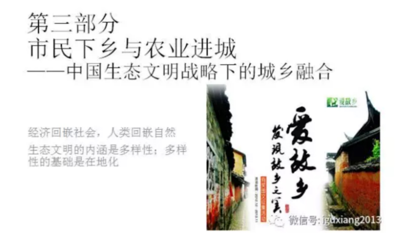 今天讲的题目是《市民下乡与农业进城》,本来就是相辅相成的概念。我们已经讲了十几年市民下乡,从2005年开始推动,当时的提法是“生态农业、环保农村”,现在已经蔚然成风。今年中央一号文件强调农业一二三产融合,农业不再仅仅当成是一产。甚至有领导干部从日本借来一个说法,讲农业是六次产业。