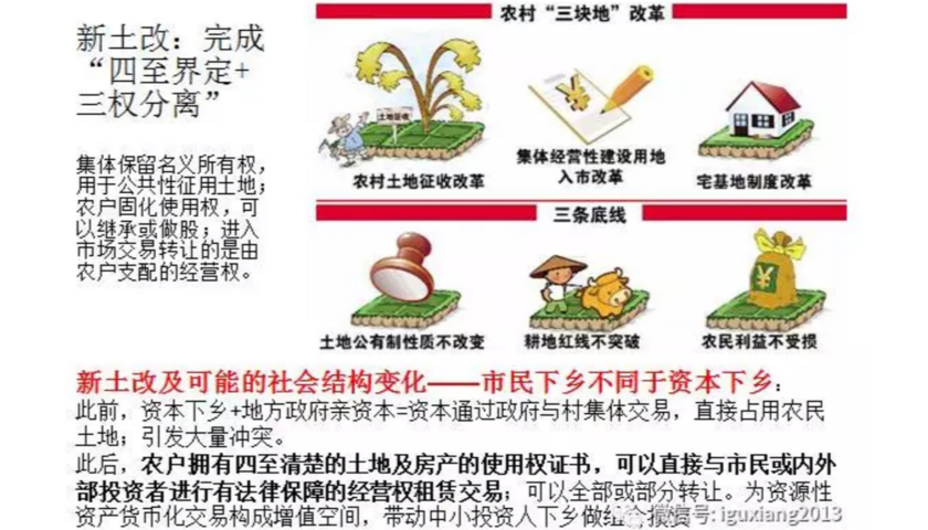 新土改: 完成 “四至界定+三权分离”。为市民下乡解决了障碍。