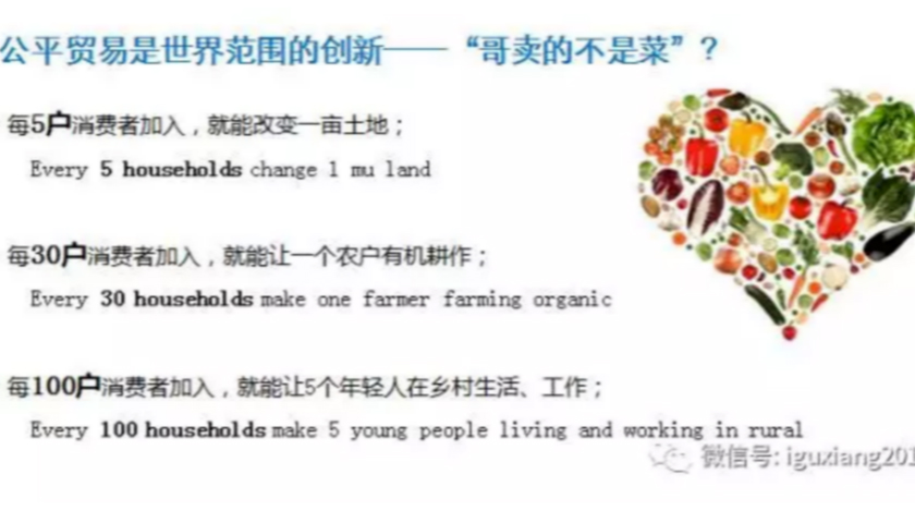 养生农业是农业的最高层次。我们在城市郊区搞得市民参与式生态农场。公平贸易在世界范围的创新——哥卖的不是菜,是文化和理念。