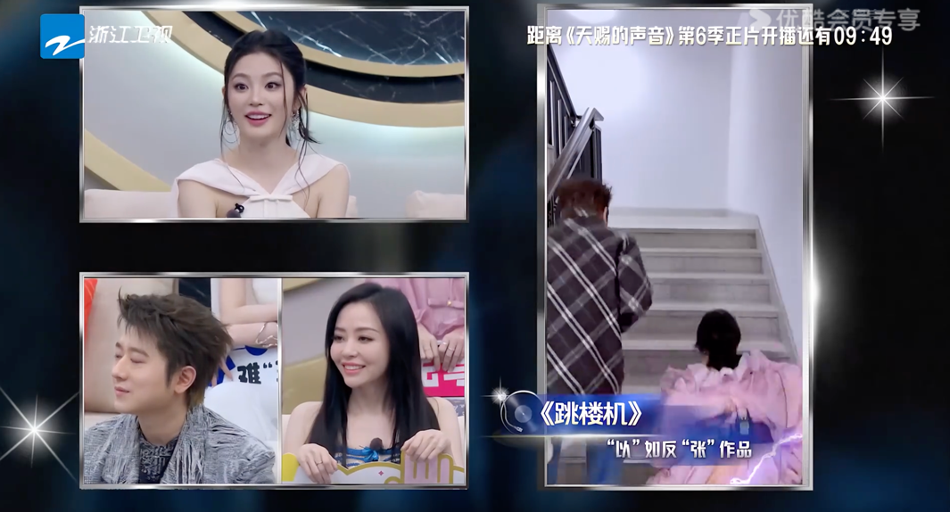 《天赐的声音6》中,谈及选曲动机时,张靓颖提出是看短剧时的灵光一现,“很多背景音乐用的都是这首歌的前奏”,意识到《跳楼机》已被市场高频记忆。王以太则进一步补充道:“确实现在非常火爆”。二人的选曲创意呈现同样紧扣短视频逻辑:并排着一步一级地跳上楼梯合唱,跳到最后气喘吁吁。这种“费力的抽象”极具话题度,被调侃为“装修现场”和“人形打桩机”。