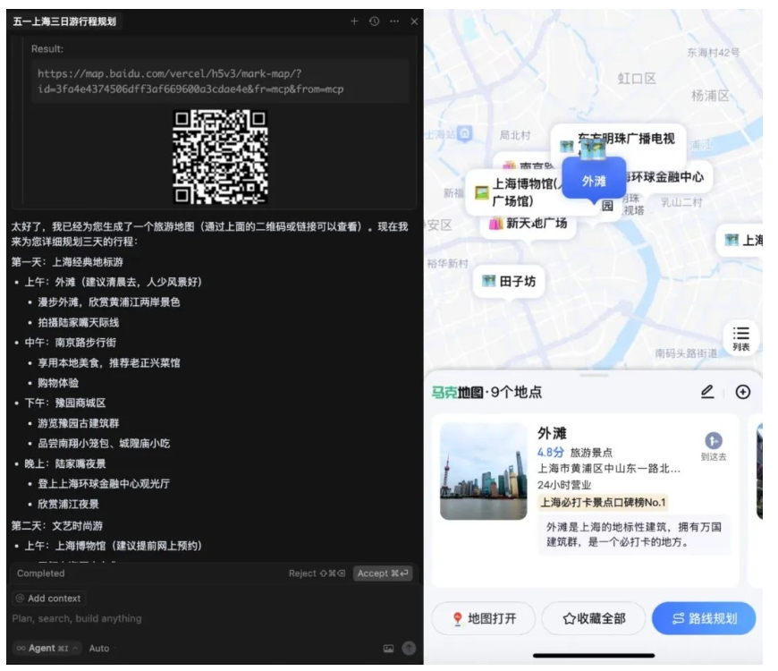 例如,用户在使用智能行程规划工具时,可以通过MCP协议实现大模型与百度地图、酒店预订系统、天气预报等服务的无缝连接,最终为用户提供优选的旅行方案,而这一切都发生在用户的指尖之间,瞬时完成,无需频繁地切换APP或网页。