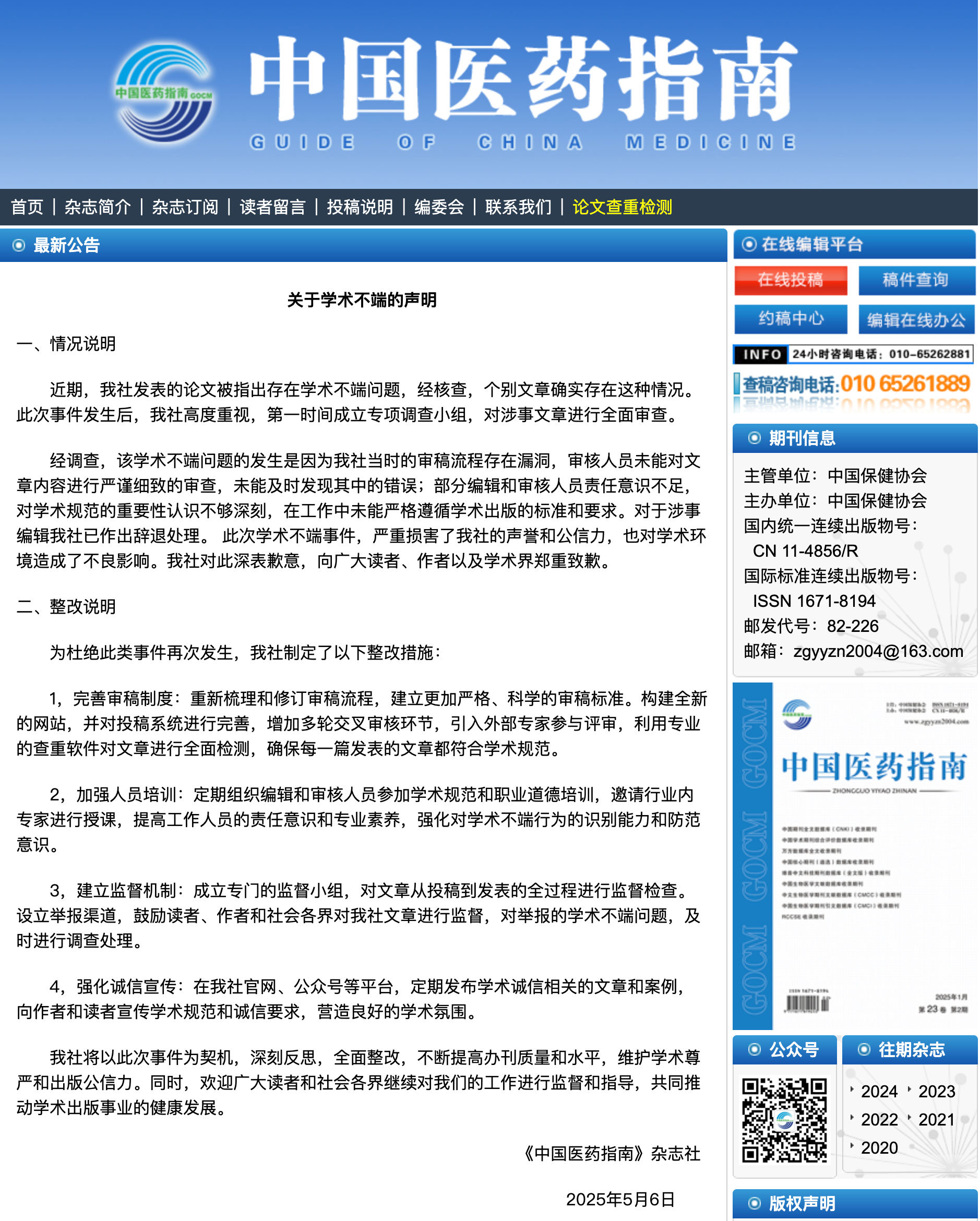 5月6日,《中国医药指南》杂志社就“多篇妇科疾病研究论文中出现男性患者”一事发布通报称,近期,该社发表的论文被指出存在学术不端问题,经核查,个别文章确实存在这种情况。经调查,该学术不端问题的发生是因为该社当时的审稿流程存在漏洞,审核人员未能对文章内容进行严谨细致的审查,未能及时发现其中的错误;部分编辑和审核人员责任意识不足,对学术规范的重要性认识不够深刻,在工作中未能严格遵循学术出版的标准和要求。对于涉事编辑该社已作出辞退处理。《中国医药指南》杂志社表示,此次学术不端事件,严重损害了该社的声誉和公信力,也对学术环境造成了不良影响。杂志社对此深表歉意,向广大读者、作者以及学术界郑重致歉。
