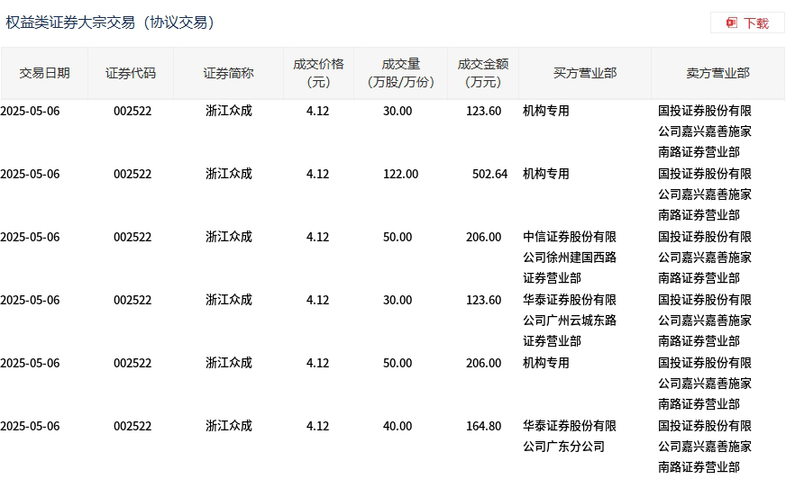 5月6日,浙江众成大宗交易成交322万股,成交额1326.64万元,占当日总成交额的11.59%,成交价4.12元,较市场收盘价4.58元折价10.04%。