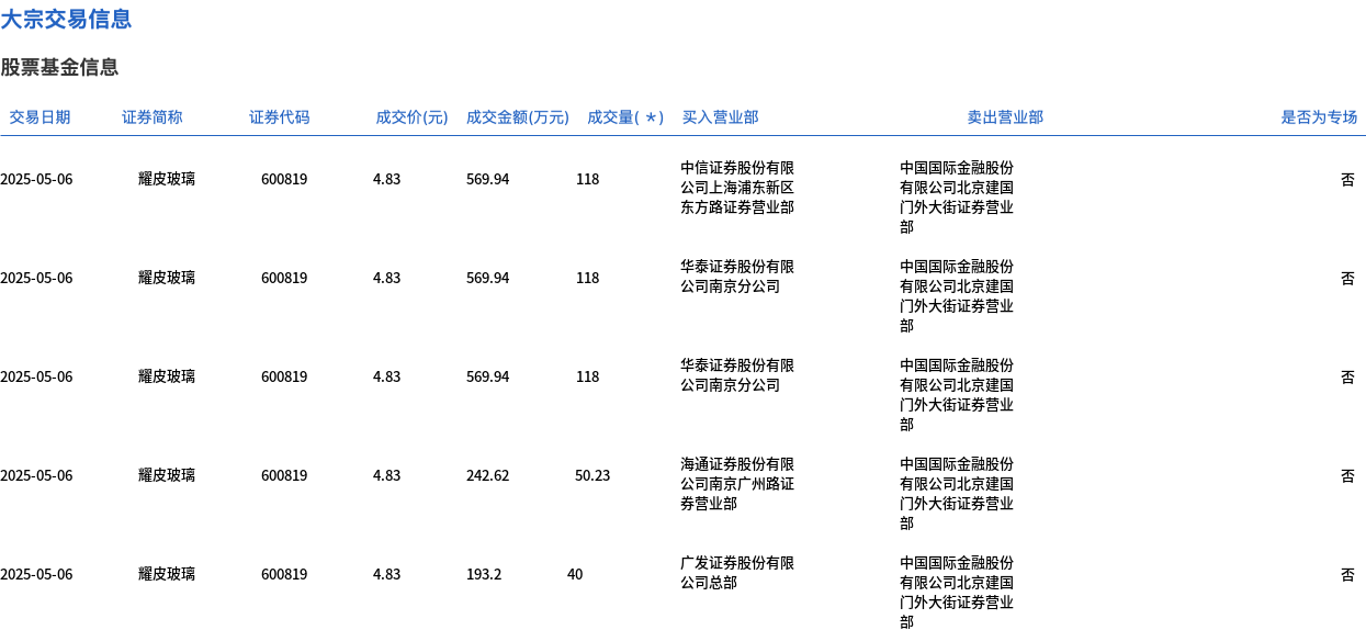 5月6日,耀皮玻璃大宗交易成交444.23万股,成交额2145.64万元,占当日总成交额的34.24%,成交价4.83元,较市场收盘价5.31元折价9.04%。