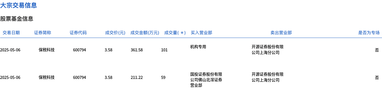 5月6日,保税科技大宗交易成交300万股,成交额1074万元,占当日总成交额的1.95%,成交价3.58元,较市场收盘价4.11元折价12.9%。