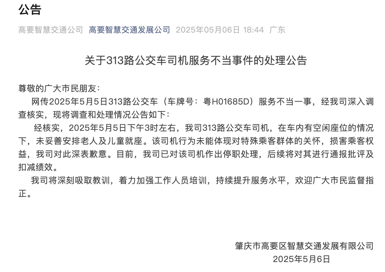 5月5日,广东肇庆网友发视频称,一位老人带孙子刷老年卡乘坐313路公交,车上有空位却被司机要求站着不能坐。对此,肇庆市高要区智慧交通发展有限公司5月6日发布公告称,经核实,2025年5月5日下午3时左右,我司313路公交车司机,在车内有空闲座位的情况下,未妥善安排老人及儿童就座。该司机行为未能体现对特殊乘客群体的关怀,损害乘客权益,我司对此深表歉意。目前,我司已对该司机作出停职处理,后续将对其进行通报批评及扣减绩效。