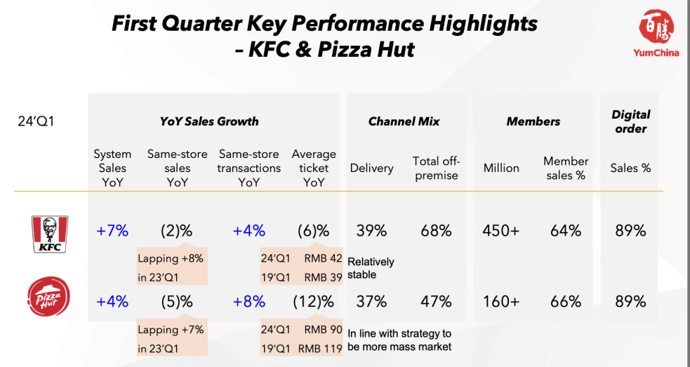 就百胜中国旗下的经典双品牌而言,2025年第一季度,百胜中国旗下肯德基的系统销售额同比增长3%,同店交易量同比增长4%,同店销售额与去年持平;必胜客的系统销售额同比增长2%,同店交易量同比增长17%,同店销售额与去年持平。
