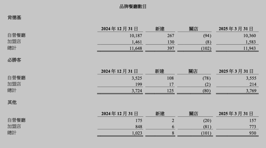 整体看,2025年一季度,百胜中国合计净新增247家门店,加盟店净新增62家,期末集团门店总数达到16642家。对于2025年全年,百胜中国计划净新增1600-1800家门店。