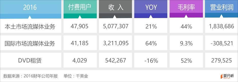 DVD租赁业务在2011年之后一直呈负增长状态,但由于在用户及渠道方面的长期积累,目前仍具保持较高的毛利水平,并为流媒体业务提供盈利支持。