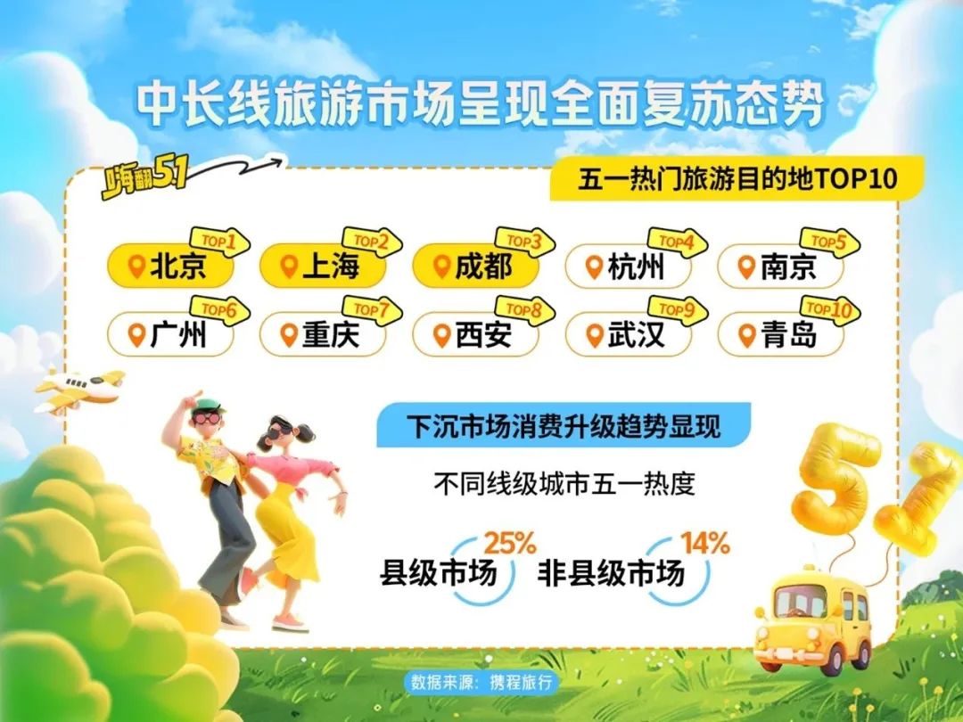 据文化和旅游部数据中心测算,假期5天全国国内出游3.14亿人次,同比增长6.4%;国内游客出游总花费1802.69亿元,同比增长8.0%,整体呈现稳步上升趋势。携程发布的《五一假期旅行数据报告》显示,今年假期旅游消费中,在网红博主“甲亢哥”现象级传播效应的带动下,入境游迎来爆发式增长,订单量同比增幅高达173%,上海、北京、广州、深圳、成都入围五一入境游Top5热门目的地,韩国、日本、新加坡、俄罗斯、马来西亚则是入境游Top5客源国。