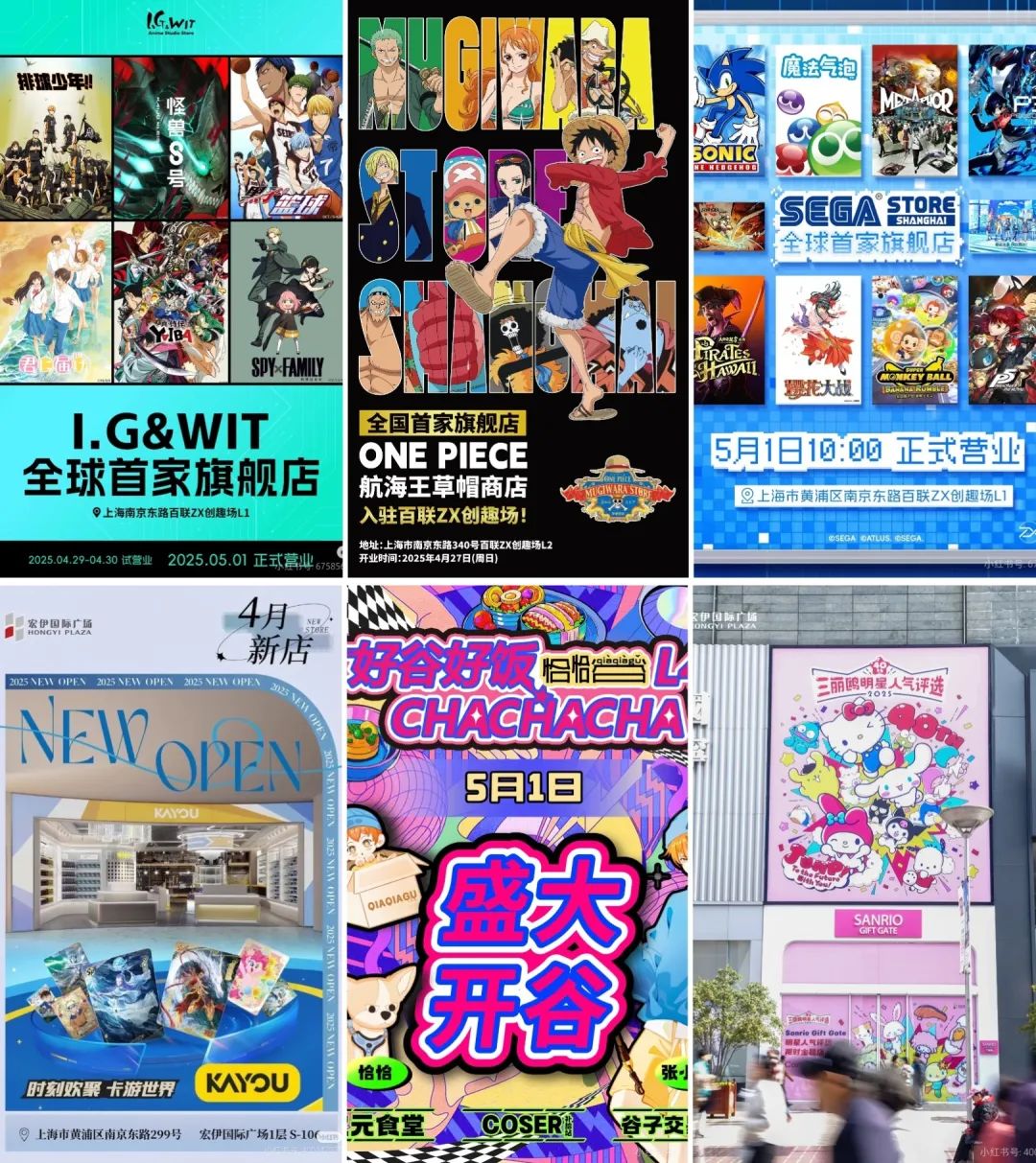 百联ZX创趣场同步推出航海王草帽商店中国首店、SEGA全球首店、I.G&WIT全球首店、环球影业全国首店(快闪店)、啾悠社全国首店等5家首店,商场单日客流、销售均创下开业以来新高;创趣场对面的悦荟广场4楼迎来焕新升级,通过引入多家二次元区域首店及人气餐饮品牌,将“好谷”与“好饭”相结合,打造了一站式次元消费新空间“恰恰谷”;坐拥泡泡玛特全球旗舰店的宏伊国际广场又接连“上新”三丽鸥人气评选限时主题店、卡游上海城市旗舰店,五一当天的进店客群一度排到了二楼……