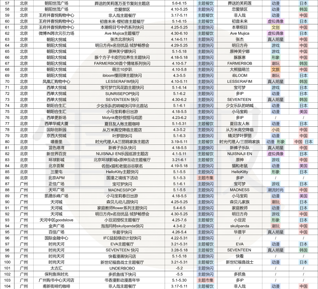 例如,上文提及的名创优品与明日方舟联动的“绒梦畅想会”主题快闪除了在杭州大悦城落地外,还在上海静安大悦城、北京朝阳大悦城、广州保利广场、深圳COCOPARK、成都滨江天街这5城的知名商业体同步落地(其中上海提前一天)。卡游推出的小马宝莉春日快闪也在全国8座城市同步开启;非人哉与奇米蛋联动的主题餐厅以及GOODSLOVE推出的跃动青春主题餐厅都是在全国三城同步开启营业。从雷报统计来看,五一快闪活动中全国范围的“首发”比例明显降低,158场快闪活动中仅有10多场快闪在宣传中着重强调了“首站首展”。
