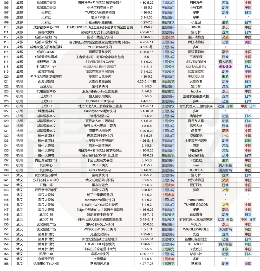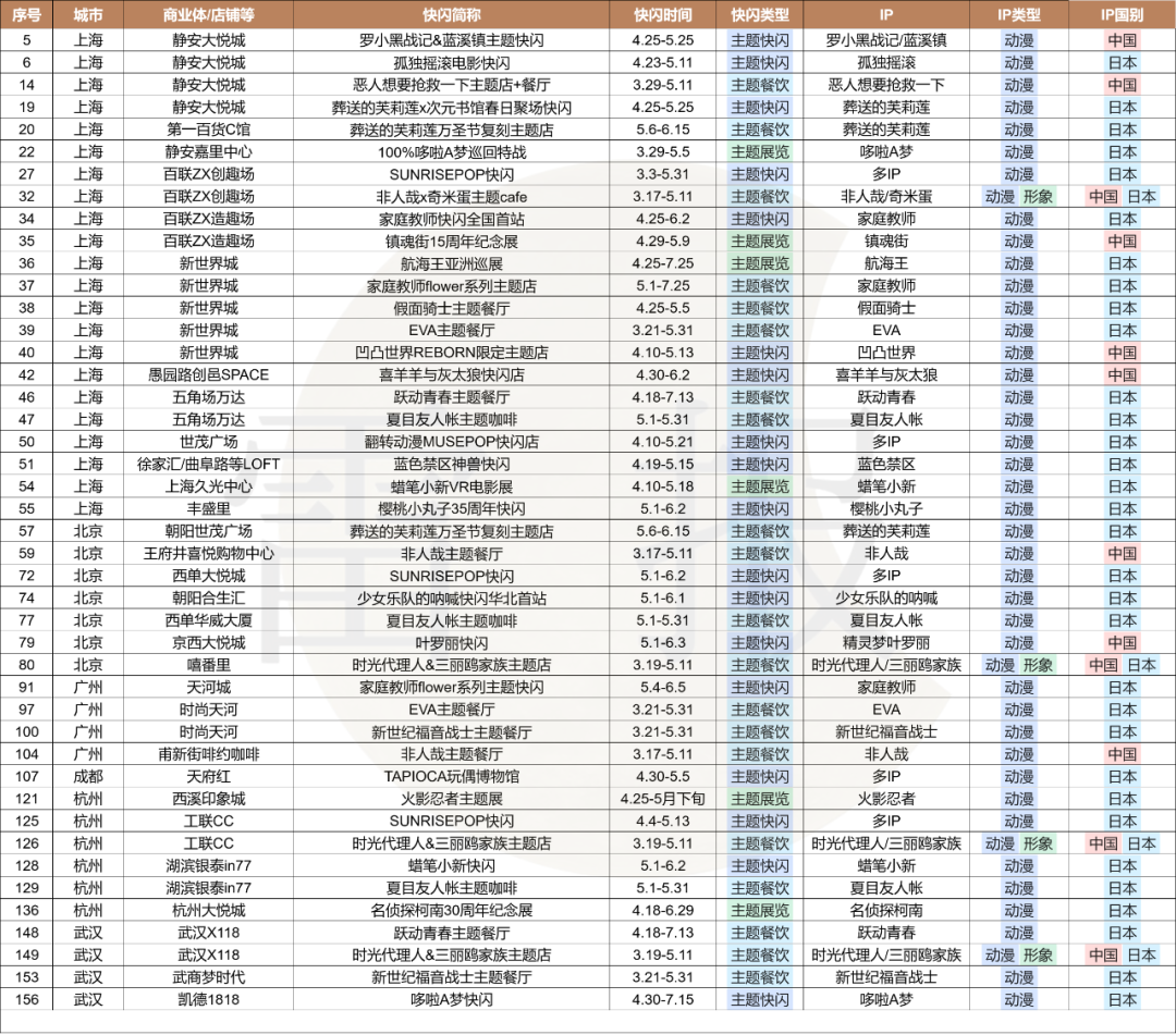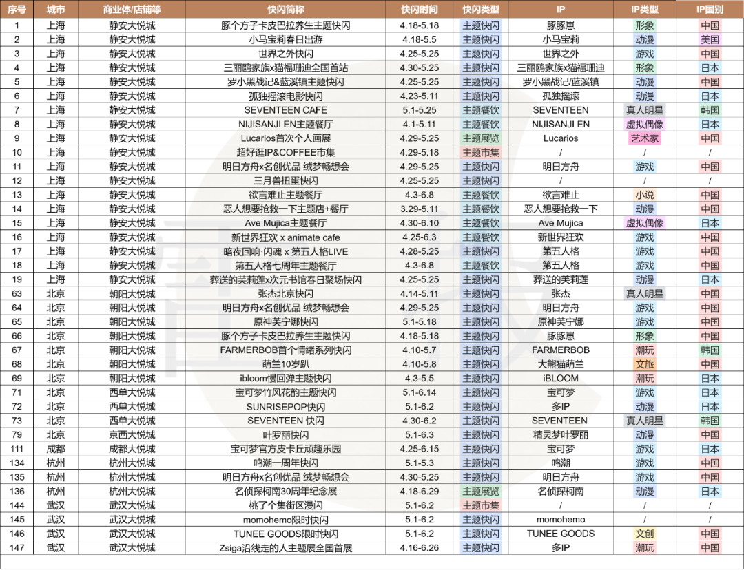 那么,五一期间全国重点六座城市的158场IP快闪有什么特点?实际的销售表现如何?又体现出怎样的新趋势呢?