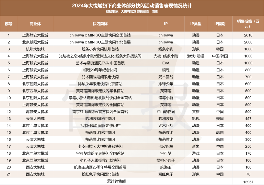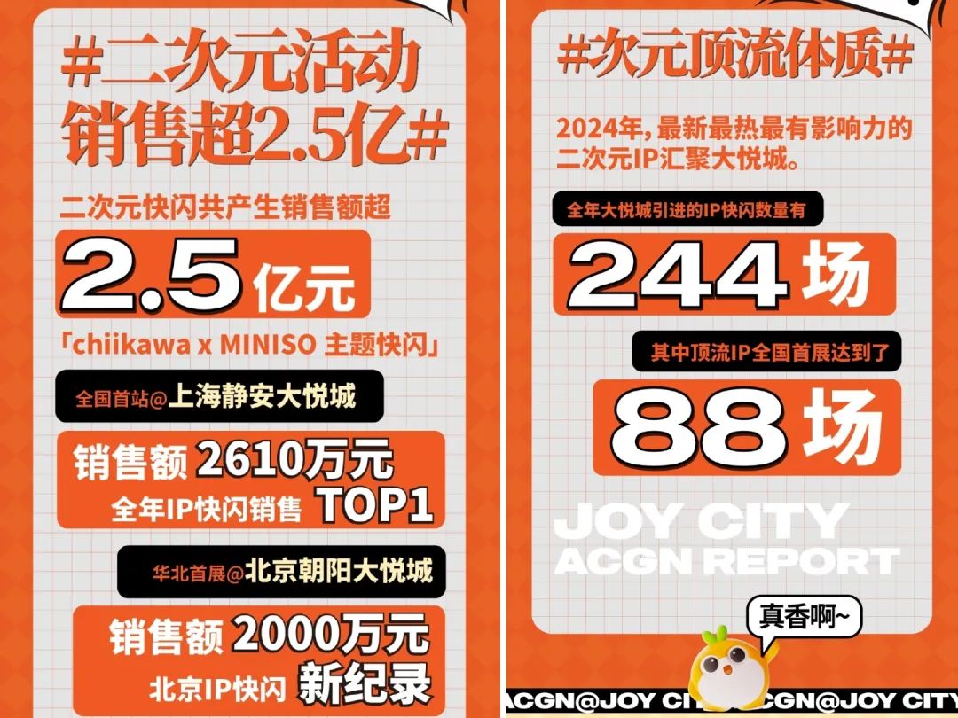 大悦城就从快闪活动中受益良多。官方数据显示,2024年,大悦城引进的IP快闪超244场,包括88场顶流IP全国首展,共产生销售额超2.5亿元。其中,位于上海的静安大悦城全年落地了56场(全国首站45场)国际顶流IP快闪,总销售额突破1.64亿元。从单场销售看,全年大悦城至少推出12场销售额超500万元的快闪活动,其中位于静安和朝阳大悦城的Chiikawa x名创优品联名快闪更突破2000万元。