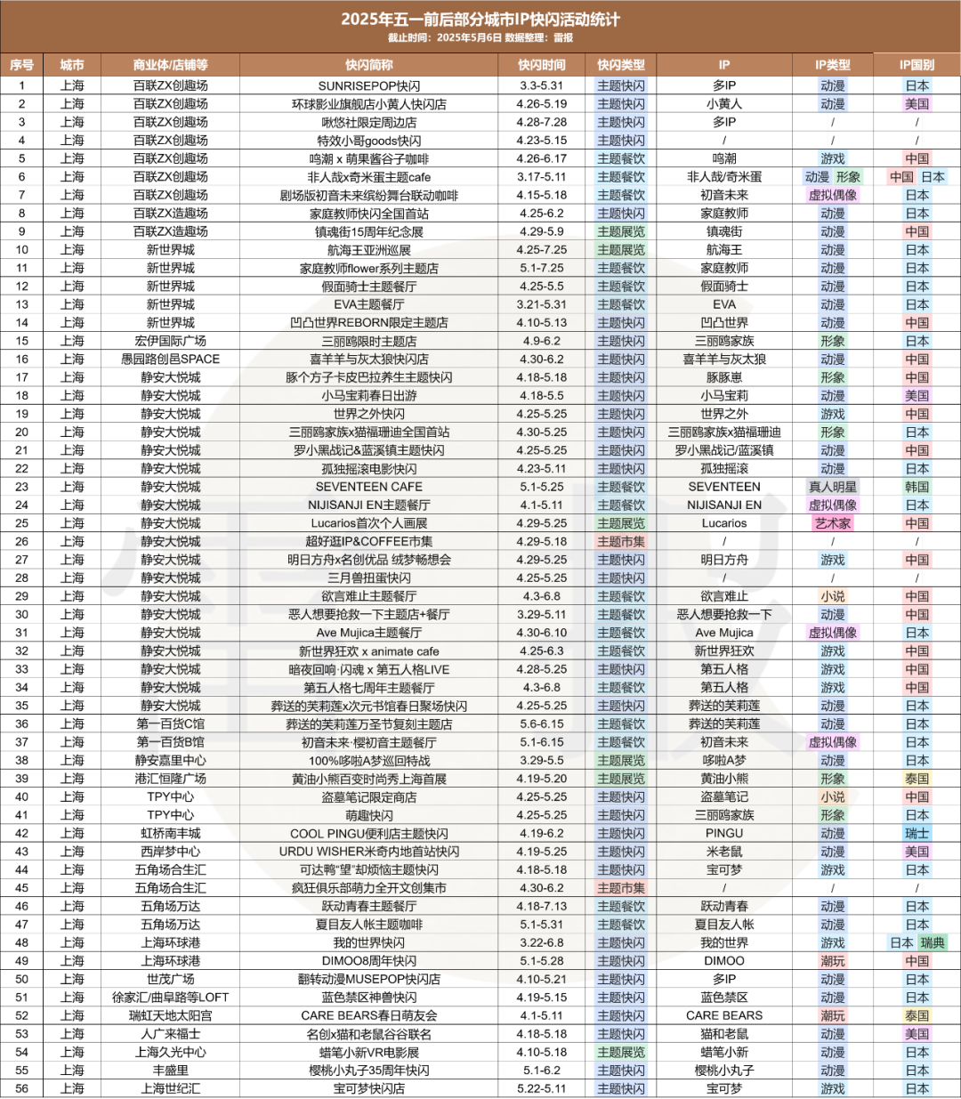 除了静安大悦城,据雷报不完全统计,今年五一前后上海全市推出的IP快闪至少有56场(人工统计存在误差)。而将目光放眼全国,上海、北京、广州、成都、杭州、及武汉6城的IP快闪活动多达158场。下文,雷报将以五一期间这6座城市重点商业体的快闪活动为例,剖析国内IP快闪业态的发展现状及未来趋势。